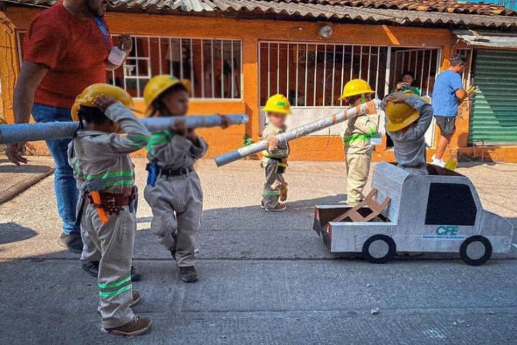 En las imágenes compartidas en redes sociales se observa a la cuadrilla de seis pequeños vistiendo el clásico uniforme de los electricistas: overol color café con franjas reflejantes y casco color amarillo con las siglas CFE. Además, algunos tienen un cinturón con herramientas.