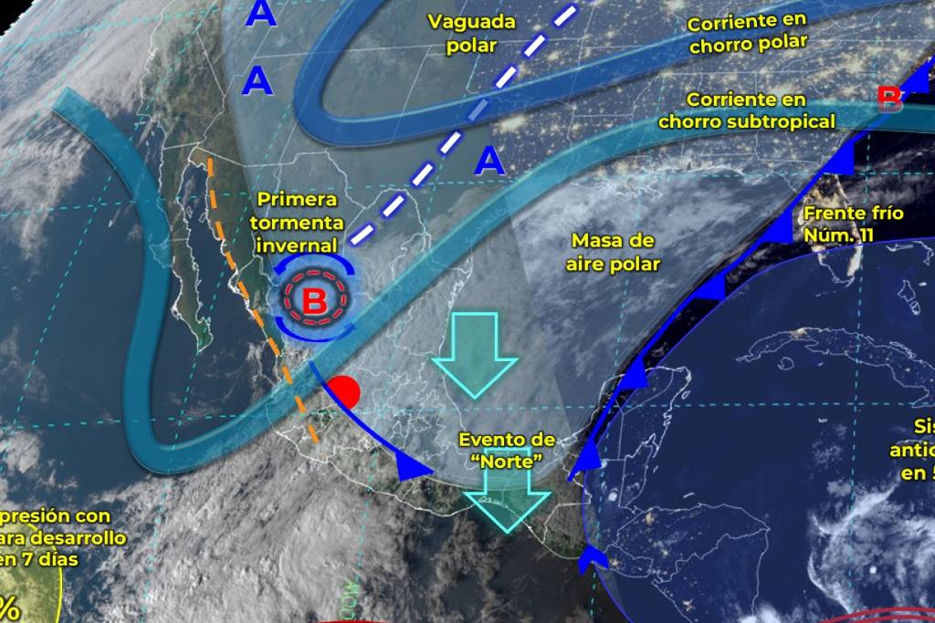 Por su parte, la primera tormenta invernal, durante la mañana se desplazará sobre Coahuila y el sur de Texas, EUA., mantendrá condiciones para la caída de nieve o aguanieve en las sierras de Coahuila y Nuevo León; además de probabilidad de lluvias y chubascos en el noreste del país.