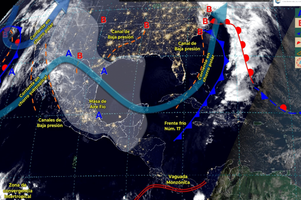El frente No. 15 se extenderá con características de estacionario sobre la frontera norte de México, se combinará con el ingreso de humedad del golfo de México, ocasionando lluvias e intervalos de chubascos acompañados de descargas eléctricas, así como vientos fuertes con posibles tolvaneras en el norte y noreste del territorio nacional.