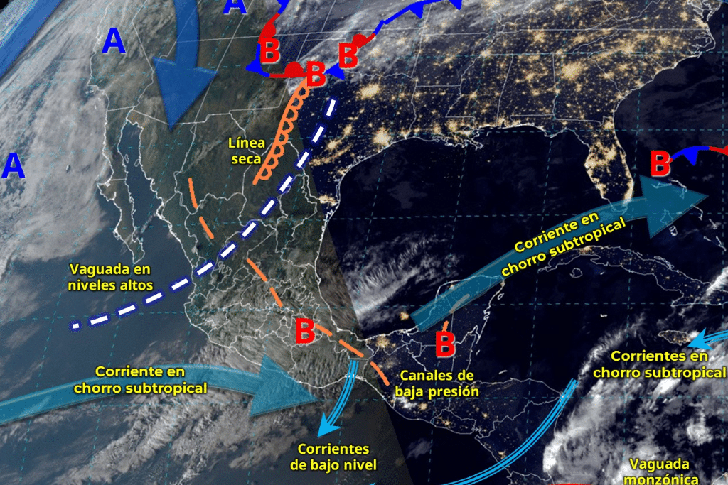 Durante esta noche y madrugada, el ingreso de humedad del océano Pacífico originado por la corriente en chorro subtropical, en interacción con una vaguada en niveles altos de la atmosfera extendida desde el noreste hasta el occidente del país, ocasionarán lluvias puntuales fuertes en Guerrero, chubascos en Jalisco, Colima, Michoacán, Veracruz, Puebla, Tlaxcala, Estado de México, Ciudad de México y Morelos, lluvias aisladas en Guanajuato, Querétaro e Hidalgo; así como ambiente frío a muy frío durante esta noche y al amanecer en la Mesa del Norte, la Mesa Central, el noroeste, occidente, noreste, oriente y centro del país. Asimismo, se mantendrá la probabilidad de caída de nieve o aguanieve en elevaciones superiores a 3,500 msnm del centro y oriente del país (Pico de Orizaba, Iztaccíhuatl, Popocatépetl, Sierra Negra, Nevado de Toluca, Ajusco, Cofre de Perote y La Malinche).
