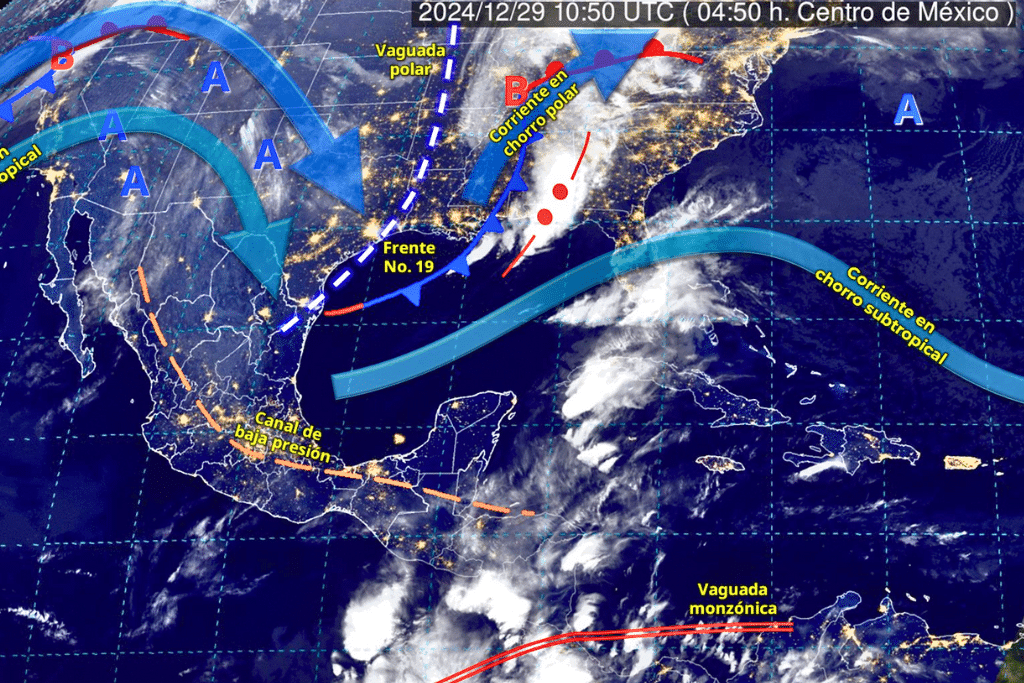 Por otra parte, prevalecerá el ambiente frío a muy frío, con posibles heladas, durante la mañana y noche, en el noroeste, Mesa del Norte, noreste, la Mesa Central y oriente del territorio nacional, incluyendo al valle de México. Finalmente, el frente No. 19 se desplazará sobre el golfo de México, dejando de afectar al país.