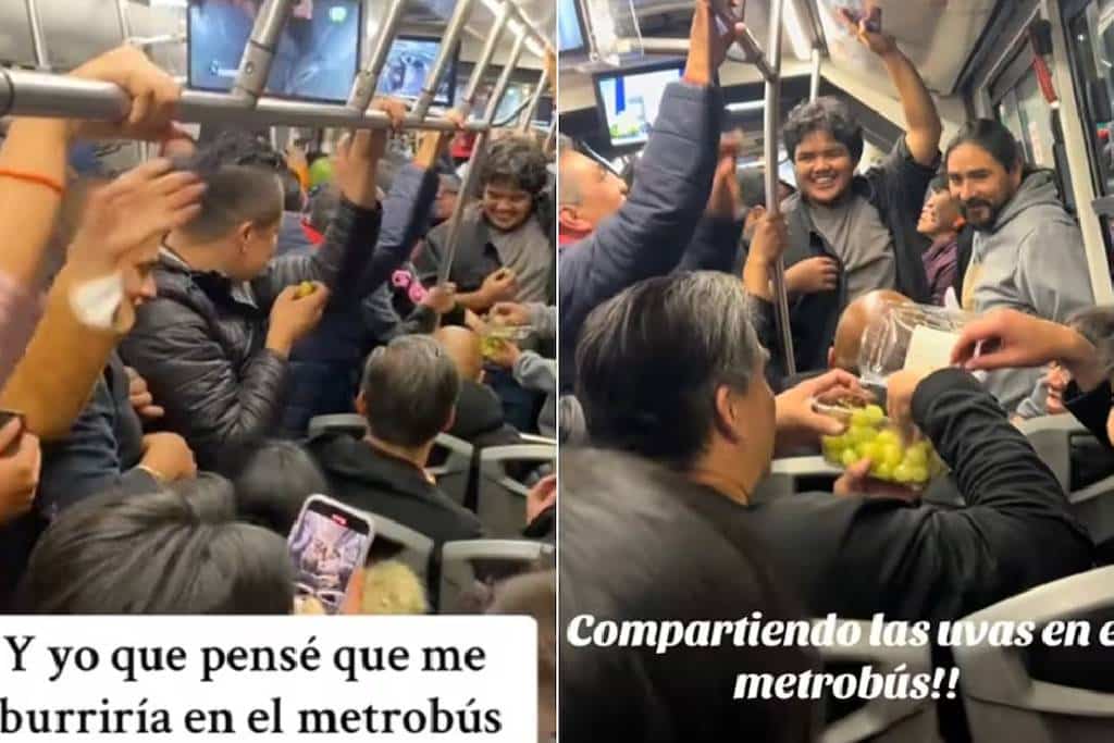 Pasajeros del Metrobús celebran Año Nuevo 2025 compartiendo uvas