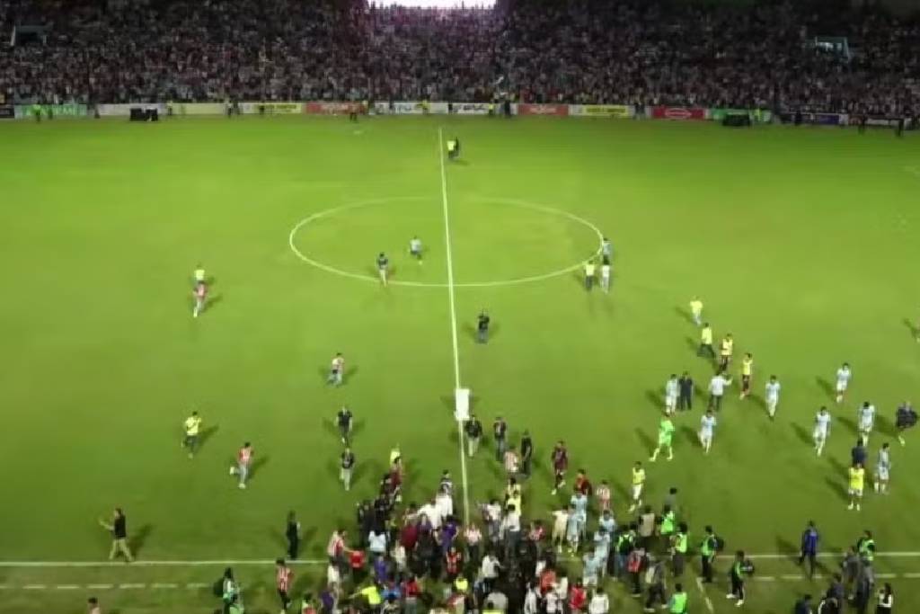 Las imágenes fueron captadas durante la transmisión del partido. donde también se observa cómo la seguridad del recinto intentó mantener el orden.