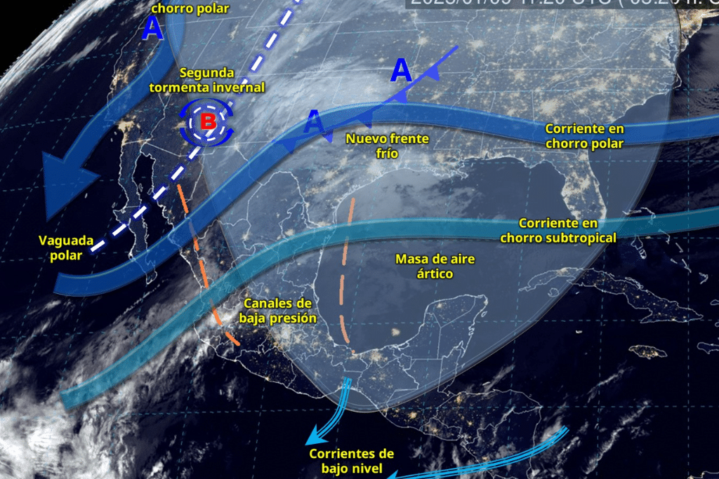 Para hoy, La segunda tormenta invernal, interaccionará con la entrada de humedad generada por las corrientes en chorro polar y subtropical, ocasionará ambiente muy frío a gélido y viento de 50 a 60 km/h con rachas de 80 a 100 km/h en el noroeste y norte de México, previéndose lluvias fuertes a muy fuertes en Sonora, Chihuahua, Coahuila, Zacatecas, Aguascalientes y el norte de Jalisco, con puntuales intensas en Durango, Sinaloa y Nayarit; así como condiciones para caída de nieve o aguanieve en sierras de Sonora, Chihuahua, Coahuila, Durango y Sinaloa, además de lluvia engelante en Zacatecas y Nuevo León. Por otra parte, un nuevo frente frío se aproximará e ingresará al norte y noreste del territorio nacional, interaccionará con un canal de baja presión extendido sobre el occidente del golfo de México, propiciará lluvias puntuales fuertes en Nuevo León y Tamaulipas, así como intervalos de chubascos en San Luis Potosí y Veracruz, además de rachas de viento de 70 a 90 km/h en Nuevo León y San Luis Potosí.