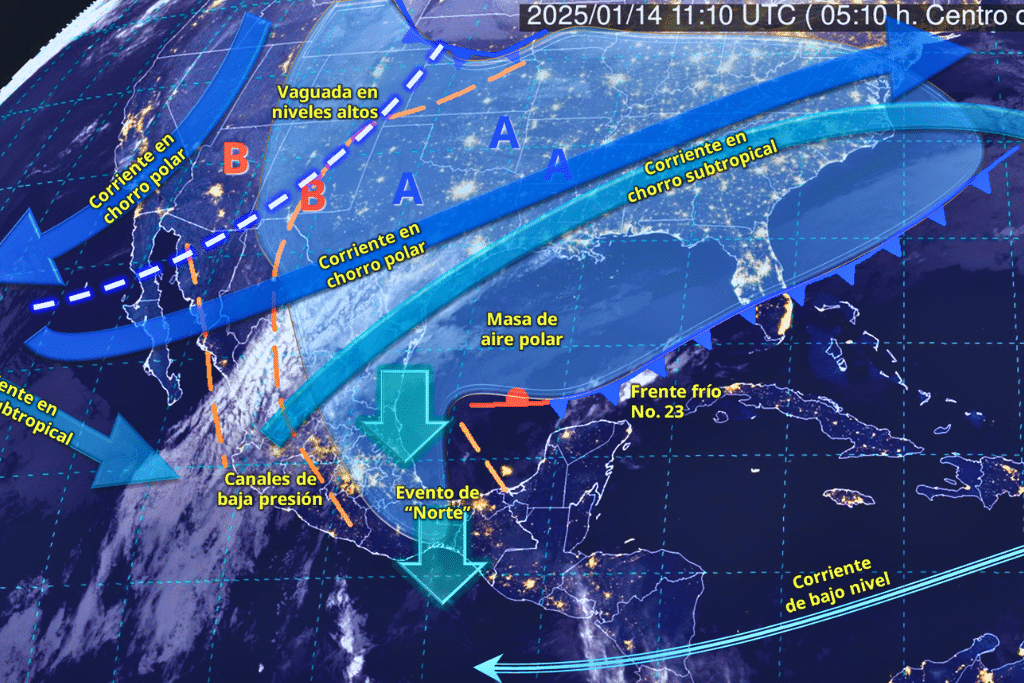 Durante este día, el frente No. 23 se extenderá con características de estacionario desde el norte de la península de Yucatán hasta el sur del golfo de México; aunado a la entrada de humedad hacia el sureste del país, generando condiciones para lluvias fuertes a puntuales muy fuertes en dichas regiones. Simultáneamente, la masa de aire polar asociada, mantendrá evento de “Norte” fuerte a muy fuerte en el litoral del golfo de México, istmo y golfo de Tehuantepec (Oaxaca y Chiapas). Asimismo, continuará el ambiente frío a muy frío durante la mañana y noche, además de heladas sobre el noroeste, norte, noreste, oriente y centro de la República Mexicana.