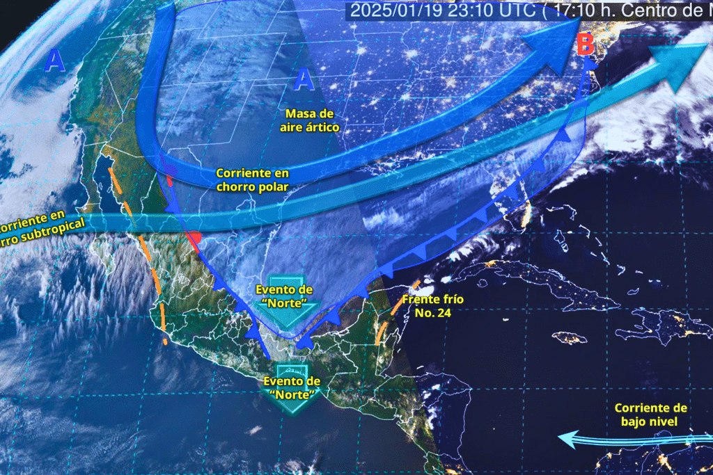 El frente frío No. 24 recorrerá el oriente y sureste del país, incluida la península de Yucatán, ocasionando lluvias puntuales muy fuertes en Veracruz, Oaxaca, Chiapas, Tabasco, Yucatán y Quintana Roo; lluvias fuertes en Puebla y Campeche; chubascos en Hidalgo y lluvias aisladas en San Luis Potosí, Querétaro y Tlaxcala. Por su parte, la masa de aire ártico asociada al frente, en interacción con la corriente en chorro subtropical, mantendrá la onda fría sobre el norte y noreste de México; asimismo se mantendrá el descenso de temperaturas en estados del noroeste, oriente, centro y sureste del territorio mexicano, presentándose ambiente gélido en sierras de Baja California, Sonora, Chihuahua, Durango y Coahuila.