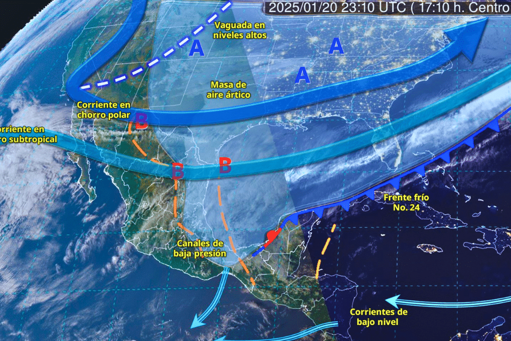El frente frío No. 24 se extenderá sobre el sureste del país, incluyendo la península de Yucatán, interaccionará con un canal de baja presión sobre el occidente del golfo de México, propiciando lluvias muy fuertes en Tamaulipas, Veracruz, Oaxaca, Chiapas, Tabasco y Quintana Roo, lluvias puntuales fuertes en Campeche y Yucatán, chubascos en Coahuila y Nuevo León, y lluvias aisladas en Puebla. La masa de aire ártico asociada al frente, en interacción con una vaguada en niveles altos de la atmósfera que se extenderá sobre el noroeste de México y con las corrientes en chorro polar y subtropical, mantendrá la onda fría en el norte y noreste de la República Mexicana, ocasionando condiciones para la caída de nieve, aguanieve o lluvia engelante en zonas de Coahuila, Nuevo León y Tamaulipas, además de viento de componente norte de 40 a 50 km/h con rachas de 60 a 80 km/h en el istmo de Tehuantepec y con oleaje de 1 a 3 metros de altura en el golfo de Tehuantepec, viento de 20 a 30 km/h con rachas de 50 a 70 km/h en Veracruz, Campeche, Yucatán y el norte de Quintana Roo, y viento de 10 a 20 km/h con rachas de 30 a 50 km/h en Tamaulipas y Tabasco, además oleaje de 1 a 3 metros de altura en costas de Tamaulipas, Veracruz, Tabasco, Campeche, Yucatán y Quintana Roo (norte).