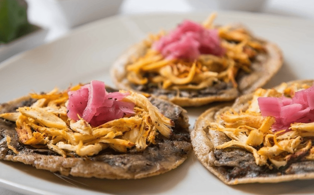 - Montar los panuchos: Coloca las tortillas rellenas en un plato y añade una capa de carne de cerdo deshebrada. Decora con cebolla morada, hojas de lechuga, rodajas de tomate y aguacate.