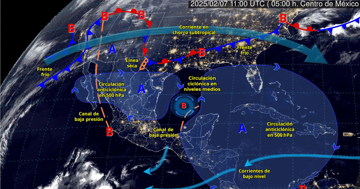 Por otra parte, una circulación anticiclónica en niveles medios de la atmósfera, mantendrá ambiente caluroso a muy caluroso en estados del litoral del Pacífico, zonas de la Mesa del Norte, la Mesa Central y la península de Yucatán, así como cielo despejado y sin lluvia en el noroeste y norte de la República Mexicana. Finalmente, un nuevo frente frío podría ingresar sobre el noroeste de México, en combinación con la corriente en chorro subtropical y una línea seca sobre el norte del territorio mexicano, originarán fuertes rachas de viento en dichas regiones, así como lluvias aisladas en Baja California.