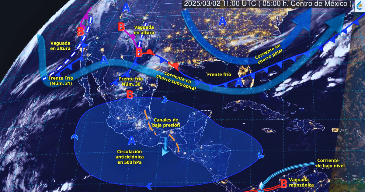 Para hoy, el frente frío núm. 30 recorrerá el norte del territorio mexicano y en interacción con una vaguada en altura situada al norte de Coahuila y con la corriente en chorro subtropical, producirán rachas de viento fuertes a muy fuertes con posibles tolvaneras en el norte y noreste del país; así como lluvias aisladas en zonas de Nuevo León y Tamaulipas. Por otra parte, la corriente en chorro subtropical y el ingreso de un nuevo frente frío (núm. 31) aunado a otra vaguada en altura, generarán chubascos en Baja California y rachas de viento muy fuertes con posibles tolvaneras en el noroeste del país.