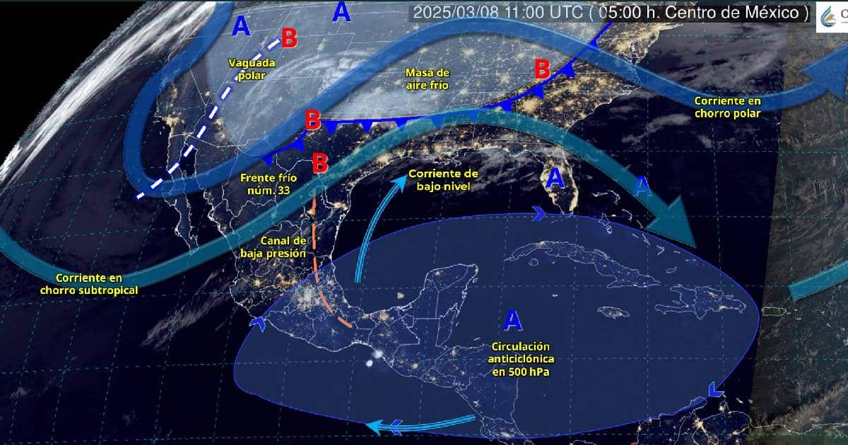 Hoy, el frente frío núm. 33 y su masa de aire frío asociada se desplazarán en el transcurso del día sobre el norte y noreste de México, en combinación con una vaguada polar y las corrientes en chorro polar y subtropical, propiciarán rachas de viento de 70 a 90 km/h en Chihuahua, Durango y Coahuila, y de 50 a 70 km/h en Zacatecas, Aguascalientes, San Luis Potosí y Nuevo León, todos con tolvaneras; además se pronostican lluvias aisladas y condiciones para la caída de nieve o aguanieve durante esta mañana en Baja California, Sonora y Chihuahua. A final del día, iniciará evento de “Norte” con rachas de viento de 70 a 90 km/h en Tamaulipas, extendiéndose durante la madrugada del domingo hacia Veracruz. El Pronostico del Tiempo para hoy sábado 22 de febrero de 2025