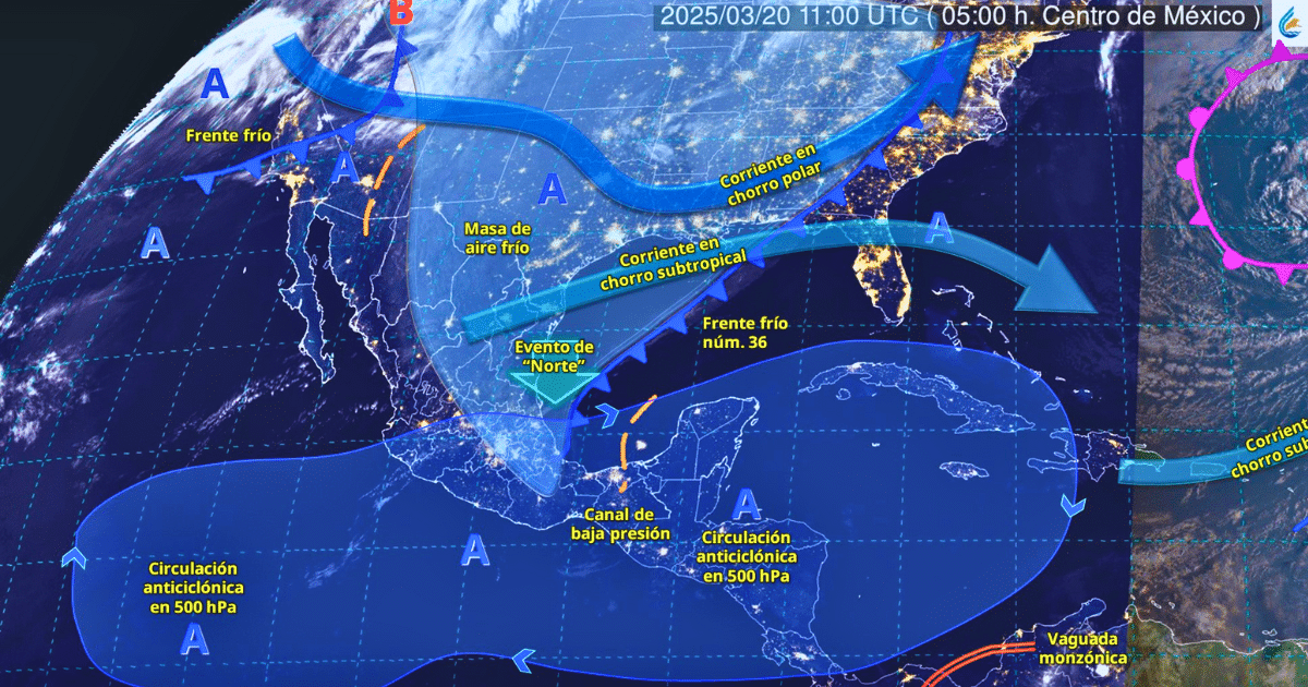 Para hoy, el frente frío núm. 36 se desplazará gradualmente sobre el sur y oriente del golfo de México, originando lluvias puntuales muy fuertes en Veracruz, Oaxaca y Chiapas; puntuales fuertes en Tabasco; intervalos de chubascos en Campeche; y lluvias aisladas en zonas de Yucatán y Quintana Roo.