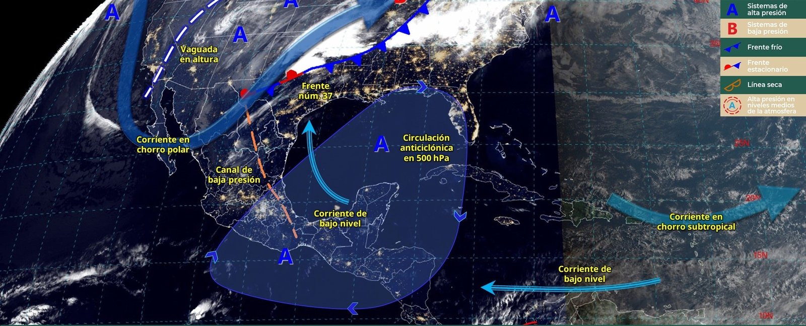 Un canal de baja presión en el oriente y sureste de México y el ingreso de humedad del océano Pacífico, golfo de México y mar Caribe, originará lluvias aisladas en Oaxaca, Tabasco y Quintana Roo, así como lluvias puntuales fuertes en Chiapas, además de rachas fuertes de viento en entidades del golfo de México y la península de Yucatán. Una circulación anticiclónica en niveles medios de la atmósfera y el escaso contenido de vapor de agua, mantendrán baja probabilidad de lluvia y ambiente diurno caluroso a muy caluroso en gran parte de la República Mexicana. Asimismo, continuará la onda de calor en zonas de Nuevo León (suroeste y sur), Tamaulipas (suroeste), San Luis Potosí (norte, centro y sur), Querétaro (centro y noreste), Hidalgo (norte, noreste y este), Puebla (norte), Michoacán (oeste), Morelos, Guerrero (norte, este y suroeste), Veracruz (centro y sur), Oaxaca (norte, centro y este) y Chiapas (oeste y centro).