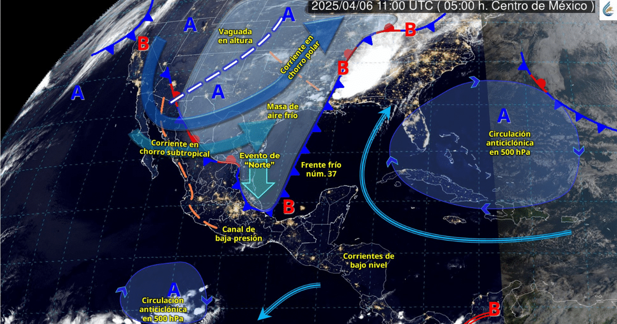 Durante este día, el frente frío núm. 37 se desplazará sobre la vertiente del golfo de México, ocasionando chubascos y lluvias fuertes en el oriente y sureste del país, incluida la península de Yucatán; lluvias puntuales muy fuertes en Veracruz y Tabasco, y puntuales intensas en Chiapas. La masa de aire frío que impulsa al frente, ocasionará descenso de temperatura sobre entidades del norte, noreste, oriente y centro de México, dando fin a la onda de calor sobre el territorio nacional. A su vez, se prevé evento de “Norte” con rachas de viento de 80 a 100 km/h y posible formación de trombas marinas en costas de Tamaulipas y Veracruz.