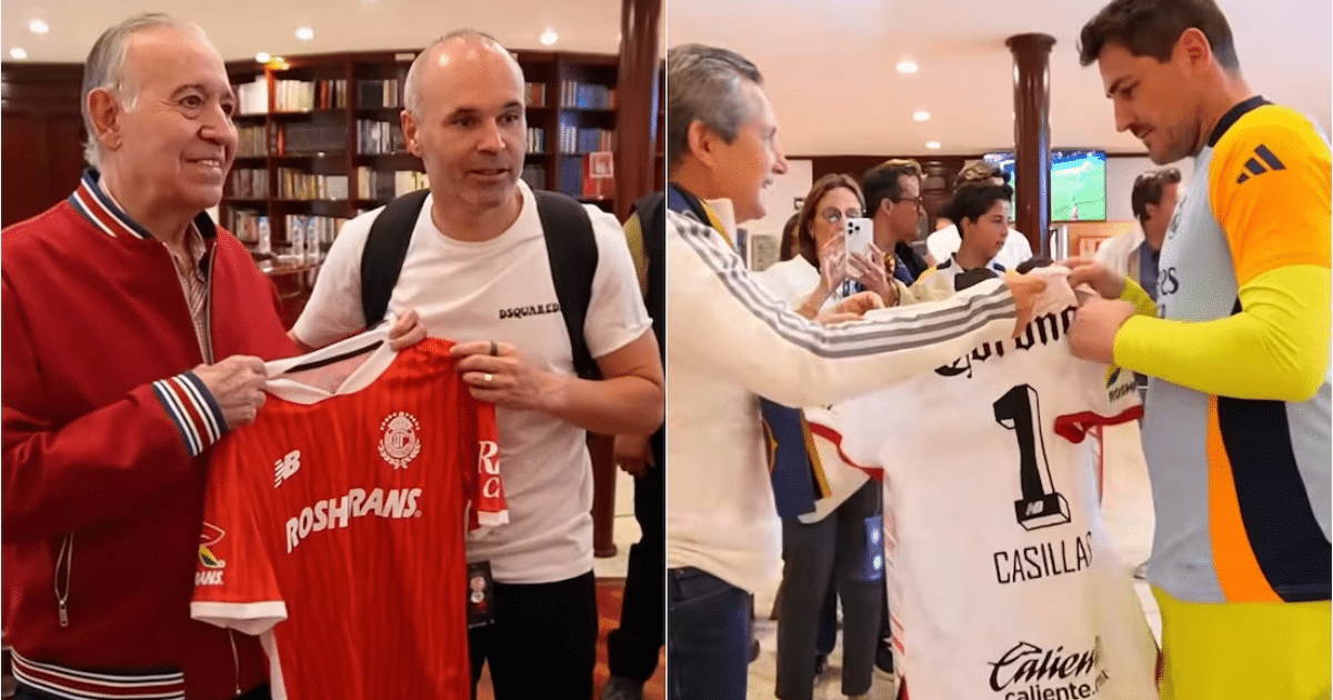 Luego del empate y la definición en penaltis que dio como gran ganador al cuadro merengue, la directiva de Toluca no perdió la oportunidad de interactuar con los exjugadores, entregando la indumentaria escarlata a Andrés Iniesta e Iker Casilla.