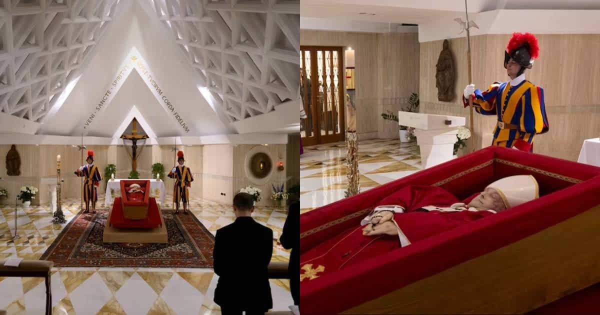 Las fotografías, captadas el lunes, muestran al primer papa latinoamericano dentro de su féretro en la capilla de la residencia de Santa Marta, vestido con una casulla roja, mitra blanca y sosteniendo un rosario entre las manos. Dos guardias suizos vigilan el féretro.