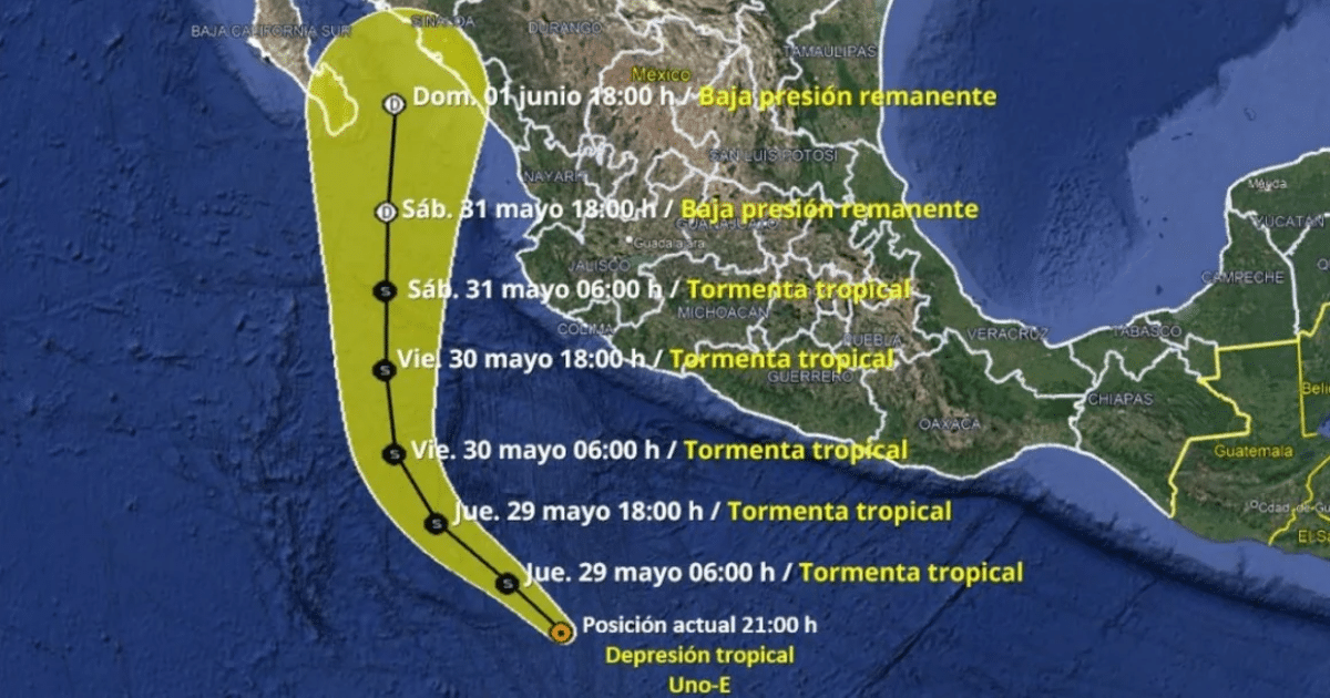 Se trata de la Depresión Tropical Uno-E, localizada actualmente al sur de Guerrero, de acuerdo con reportes de la Comisión Nacional del Agua (Conagua). De consolidarse, este sistema recibiría el nombre de Alvin, el primero en la lista oficial de la Organización Meteorológica Mundial para el océano Pacífico en 2025.