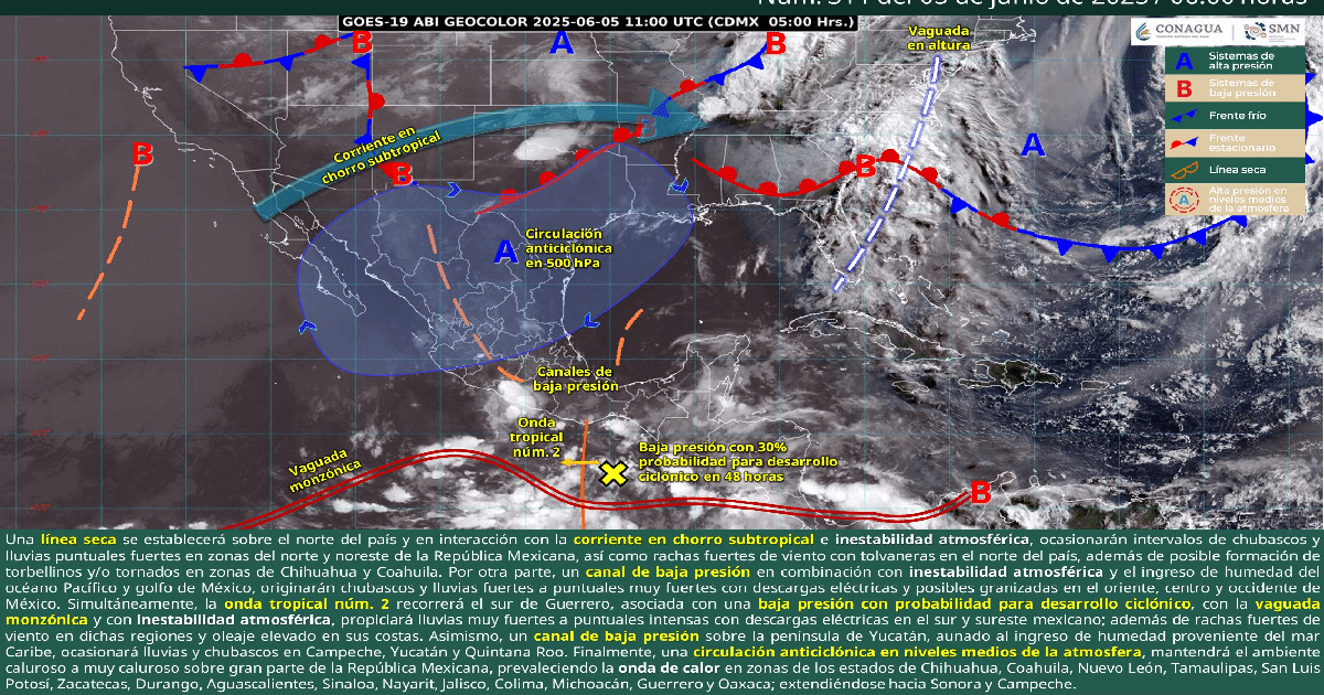 Durante este día, una línea seca se establecerá sobre el norte del país y en interacción con la corriente en chorro subtropical e inestabilidad atmosférica, ocasionarán intervalos de chubascos y lluvias puntuales fuertes en zonas del norte y noreste de la República Mexicana, así como rachas fuertes de viento con tolvaneras en el norte del país, además de posible formación de torbellinos y/o tornados en zonas de Chihuahua y Coahuila. Por otra parte, un canal de baja presión en combinación con inestabilidad atmosférica y el ingreso de humedad del océano Pacífico y golfo de México, originarán chubascos y lluvias fuertes a puntuales muy fuertes con descargas eléctricas y posibles granizadas en el oriente, centro y occidente de México. Simultáneamente, la onda tropical núm. 2 recorrerá el sur de las costas de Guerrero, asociada con una baja presión con probabilidad para desarrollo ciclónico, con la vaguada monzónica y con inestabilidad atmosférica, propiciará lluvias muy fuertes a puntuales intensas acompañadas con descargas eléctricas en el sur y sureste mexicano; además de rachas fuertes de viento en dichas regiones y oleaje elevado en sus costas. Asimismo, un canal de baja presión sobre la península de Yucatán, aunado al ingreso de humedad proveniente del mar Caribe, ocasionará lluvias y chubascos en Campeche, Yucatán y Quintana Roo. Finalmente, una circulación anticiclónica en niveles medios de la atmosfera, mantendrá el ambiente caluroso a muy caluroso sobre gran parte de la República Mexicana, prevaleciendo la onda de calor en los estados de Chihuahua, Coahuila (oeste y suroeste), Nuevo León (sur), Tamaulipas (suroeste), San Luis Potosí (norte), Zacatecas, Durango, Aguascalientes (sur), Sinaloa, Nayarit, Jalisco, Colima, Michoacán, Guerrero (noroeste y oeste) y Oaxaca (centro, sur y este); extendiéndose hacia Sonora (sur) y Campeche (norte y oeste).