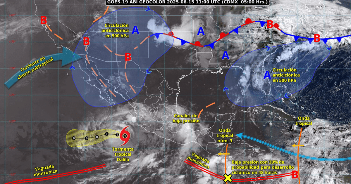 Según el Servicio Meteorológico Nacional (SMN), aunque Dalila se aleja de las costas mexicanas, su amplia circulación continuará impactando el occidente del país. En tanto, la onda tropical 3, que cruza el sureste, se asocia con una zona de baja presión que podría evolucionar a ciclón en los próximos días.