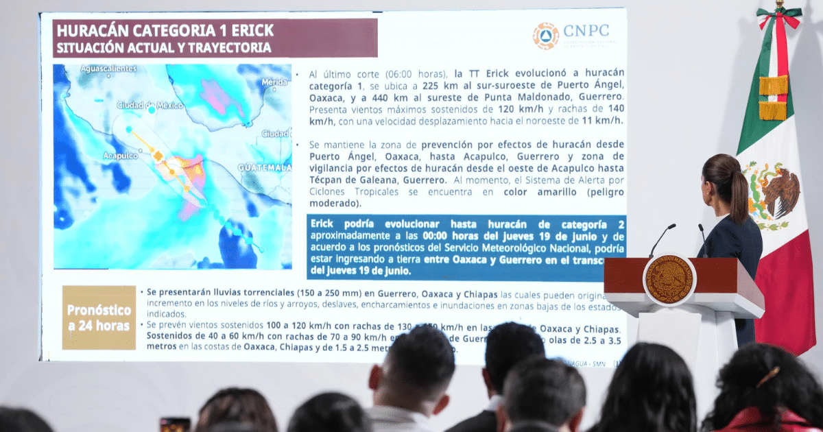 La Presidenta de México, Claudia Sheinbaum Pardo, hizo un llamado a la población de Oaxaca y Guerrero a no salir, resguardarse, acudir a los refugios y mantenerse informados ante la llegada del Huracán Erick, que se espera entre la noche de este miércoles y la madrugada del jueves.
