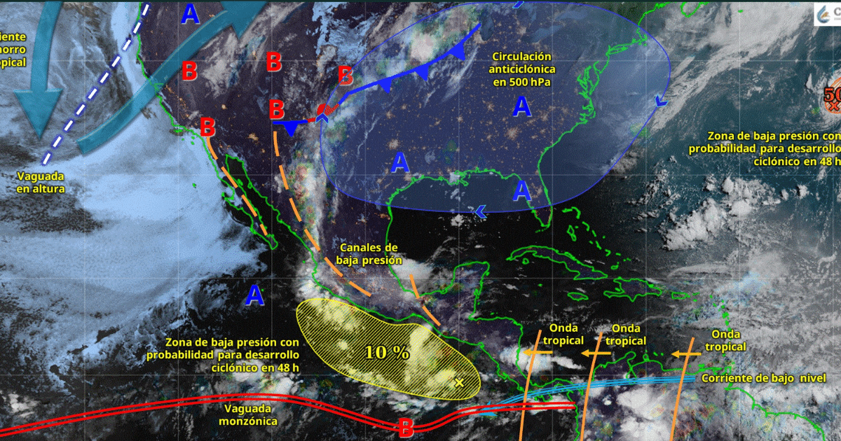 El ingreso de aire húmedo del océano Pacífico y la proximidad de una zona de baja presión con probabilidad para desarrollo ciclónico situada al sur de Guatemala, aunados a la vaguada monzónica frente a costas del Pacífico sur mexicano, generarán lluvias puntuales intensas en Oaxaca, Michoacán, Colima y Jalisco; y puntuales muy fuertes en Guerrero. A su vez, la entrada de aire húmedo del mar Caribe y un canal de baja presión extendido desde el sur del golfo de México hasta el sureste del país, originarán lluvias puntuales intensas en Chiapas; puntuales muy fuertes en Tabasco; y puntuales fuertes en Quintana Roo, Yucatán y Campeche. Finalmente, persistirá el ambiente cálido a caluroso por la tarde sobre entidades del noroeste, norte, noreste, oriente, occidente, sur y sureste del territorio mexicano, además de la península de Yucatán, con temperaturas máximas muy calurosas, superiores a 40 °C en Baja California (noreste), Sonora (este y sureste), Chihuahua (noreste) y Sinaloa (norte).