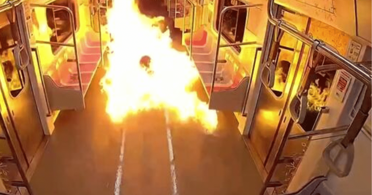 Instantes después, el hombre le prende fuego al combustible y las llamas se apoderan del vagón que luce con pocas personas.