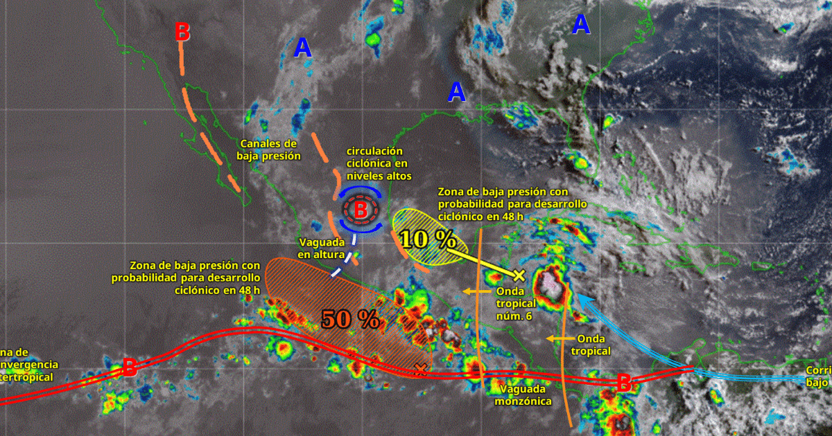 Este día, la onda tropical núm. 6 será absorbida por la zona de baja presión con probabilidad para desarrollo ciclónico del océano Pacífico, la cual se desplazará al sur de las costas de Oaxaca y Chiapas; interaccionará con un canal de baja presión en el sureste mexicano y aunado al ingreso de humedad del océano Pacífico, golfo de México y mar Caribe, así como la aproximación de una onda tropical a la península de Yucatán, generarán lluvias puntuales intensas en Veracruz, Oaxaca, Chiapas, Tabasco, Campeche y Quintana Roo, además de lluvias muy fuertes en Yucatán.