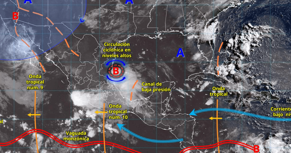 Este día, el monzón mexicano sobre el noroeste del territorio nacional, ocasionará chubascos y lluvias puntuales fuertes en Baja California Sur, Sonora y Chihuahua, así como lluvias puntuales intensas en Durango (oeste y suroeste), Sinaloa (centro y sur) y Nayarit (norte). Simultáneamente, canales de baja presión sobre el norte, noreste, centro y oriente del país, en combinación con una circulación ciclónica en niveles altos de la atmósfera; aunado a inestabilidad atmosférica y el desplazamiento de la onda tropical núm. 10 sobre el sur y occidente de México, propiciarán chubascos y lluvias fuertes a puntuales muy fuertes en estados del norte, noreste, oriente, centro, occidente y sur de la República Mexicana; con lluvias puntuales intensas en Jalisco (occidente). Por otra parte, la onda tropical núm. 9 ha dejado de afectar al país. A su vez, otro canal de baja presión en el sureste mexicano, en interacción con inestabilidad atmosférica y con el ingreso de humedad del océano Pacífico, golfo de México y mar Caribe, originará lluvias fuertes a muy fuertes en dicha región, además de la península de Yucatán. Finalmente, continuará el ambiente caluroso a muy caluroso en zonas del noroeste y norte del territorio mexicano, así como península de Yucatán; manteniéndose la onda de calor en zonas de Baja California (noreste) y Sonora (noroeste y centro).