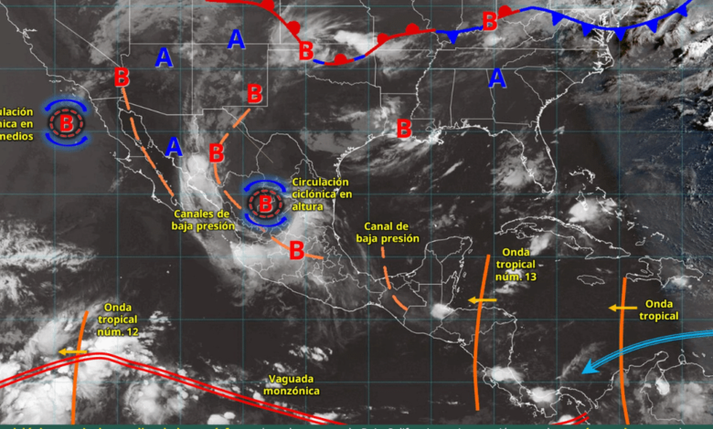 La onda tropical núm. 13 recorrerá la península de Yucatán, en combinación con un canal de baja presión en el sureste del país, lo que producirá lluvias puntuales fuertes en Quintana Roo, Yucatán, Campeche, Tabasco y Chiapas. Finalmente, continuará el ambiente cálido a caluroso por la tarde sobre entidades del noroeste, norte, centro, sur y sureste del país, incluida la península de Yucatán, llegando a ser muy caluroso con temperaturas máximas de 40 a 45 grados en zonas de Baja California, Sonora y Chihuahua.