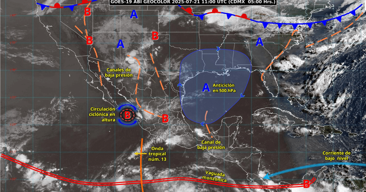 Este día, el monzón mexicano en combinación con una circulación ciclónica en altura sobre el noroeste del país, ocasionará chubascos y lluvias fuertes en dicha región, así como lluvias puntuales muy fuertes en Sonora y Chihuahua. Por otra parte, canales de baja presión sobre la Mesa del Norte, la Mesa Central y el noreste de la República Mexicana; aunado a inestabilidad atmosférica y al paso de la onda tropical núm. 13 sobre el occidente de México, propiciarán chubascos y lluvias fuertes en las regiones mencionadas; con lluvias puntuales muy fuertes en Zacatecas, Aguascalientes, Jalisco, Colima y Michoacán. Simultáneamente, canales de baja presión sobre el sureste mexicano y la península de Yucatán, en interacción con inestabilidad atmosférica y con el ingreso de humedad, originarán chubascos y lluvias fuertes en ambas regiones. Las lluvias pronosticadas podrían acompañarse con descargas eléctricas y caída de granizo. Finalmente, continuará el ambiente caluroso a muy caluroso en entidades del norte del territorio nacional, estados del Pacífico Mexicano y la península de Yucatán; con temperaturas máximas de 40 a 45 °C en Baja California (noreste) y Sonora (noroeste).