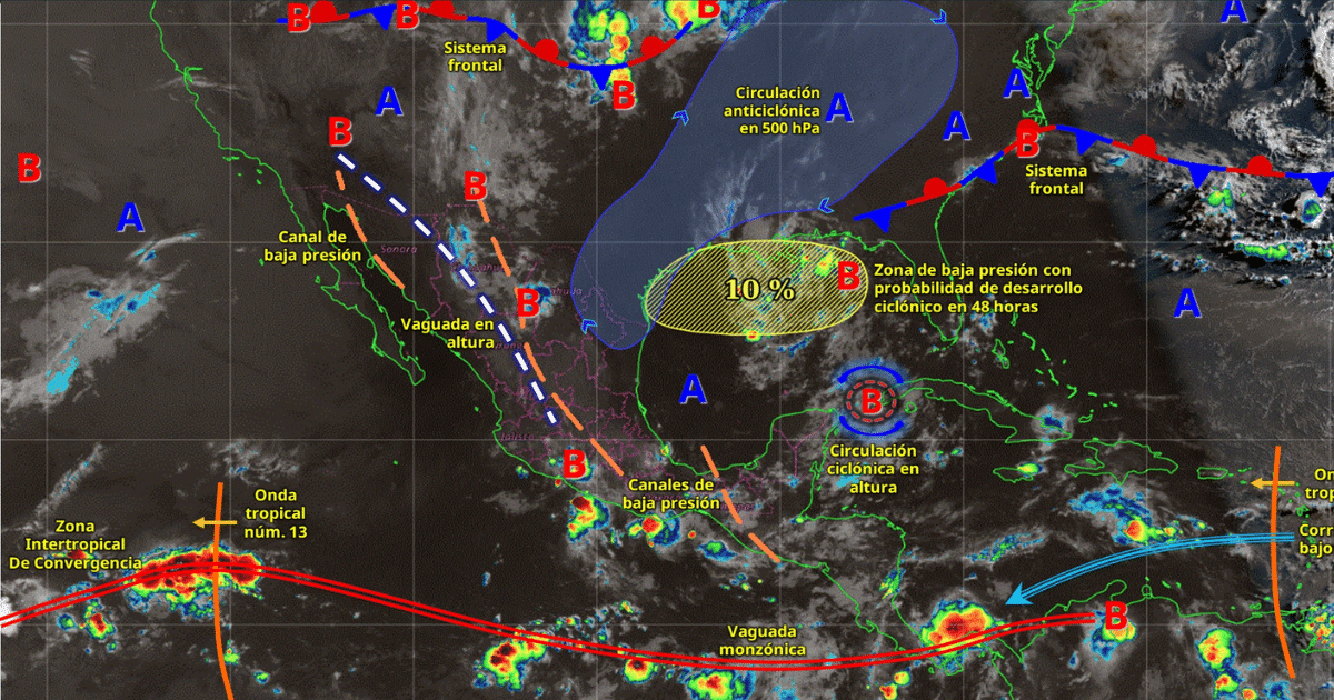 Para hoy, el monzón mexicano persistirá sobre el noroeste del territorio nacional y en interacción con una vaguada en altura producirán lluvias puntuales fuertes en Nayarit, Durango y Chihuahua; lluvias con intervalos de chubascos en Sinaloa; y lluvias aisladas en zonas de Sonora. El ingreso de aire húmedo del golfo de México y océano Pacífico, en interacción con un canal de baja presión sobre la Mesa del Norte y con inestabilidad atmosférica en el occidente del país, ocasionarán lluvias puntuales muy fuertes en Michoacán y Guerrero; puntuales fuertes en Veracruz, Puebla, Morelos, Ciudad de México, Estado de México, Colima y Jalisco; intervalos de chubascos en Tlaxcala e Hidalgo; y lluvias aisladas en zonas de Querétaro, Guanajuato, Aguascalientes, Zacatecas, San Luis Potosí, Tamaulipas, Nuevo León y Coahuila. Otro canal de baja presión sobre el sureste mexicano y una circulación ciclónica en altura frente a las costas de Quintana Roo que se desplazará desde la península de Yucatán hasta el sureste del país, así como la entrada de aire húmedo del mar Caribe, generarán lluvias puntuales muy fuertes en Oaxaca; y puntuales fuertes en Quintana Roo, Yucatán, Campeche, Tabasco y Chiapas. Finalmente, continuará el ambiente cálido a caluroso por la tarde en el norte, occidente, oriente, sur y sureste del territorio mexicano y península de Yucatán, así como ambiente muy caluroso con temperaturas máximas superiores a los 40 °C en zonas de la península de Baja California, noroeste y estados fronterizos del norte y noreste de México, previéndose a partir de hoy el inicio de una onda de calor en zonas de Baja California, Baja California Sur y Sonora.
