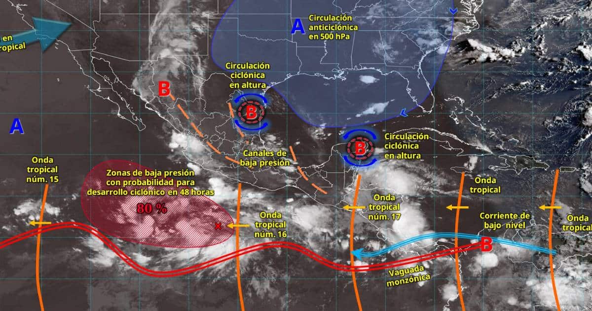 Simultáneamente, la onda tropical núm. 16 se desplazará sobre Guerrero, en donde se prevén lluvias puntuales muy fuertes; mientras que un canal de baja presión sobre el sureste mexicano interactuará con la onda tropical núm. 17,que recorrerá la península de Yucatán y con una circulación ciclónica en altura sobre dicha península, condiciones que generarán lluvias puntuales intensas en Veracruz (sur), Oaxaca (norte y este) y Chiapas (este y sur); así como lluvias fuertes a muy fuertes en Tabasco, Campeche, Yucatán y Quintana Roo.
