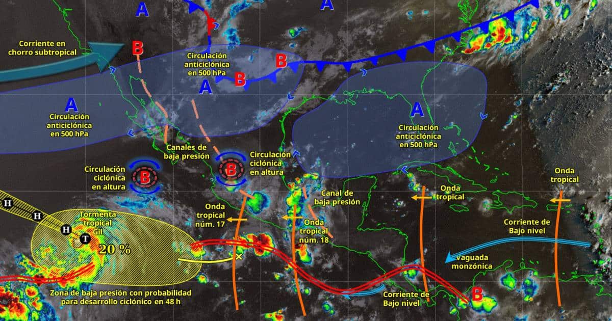 El desplazamiento de la onda tropical núm. 17, sobre el occidente del país, originará lluvias puntuales intensas con descargas eléctrica en Jalisco, Colima y Michoacán, y con posible caída de granizo en zonas altas de Jalisco. Se prevé que dicha onda continúe avanzando hacia el oeste y dejando de afectar al país al final del día. Otro canal de baja presión sobre Chiapas y Tabasco y la entrada de aire húmedo del mar Caribe, en interacción con la onda tropical núm. 18 que se desplazará sobre el sureste y sur del territorio nacional, propiciarán lluvias puntuales muy fuertes en Chiapas, Oaxaca y Veracruz; y puntuales fuertes en Quintana Roo, Yucatán, Campeche y Tabasco, todas acompañadas con descargas eléctricas.