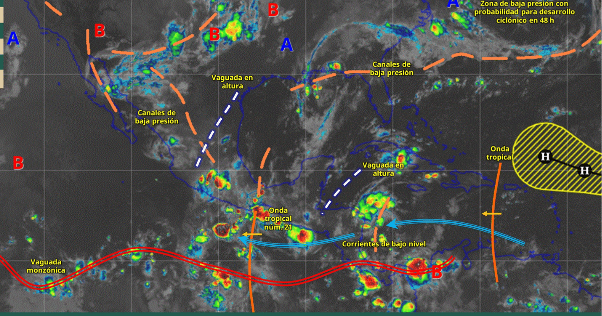 La onda tropical núm. 21 sobre el sur de Oaxaca, interaccionará con otra vaguada en altura sobre la península de Yucatán, con un canal de baja presión en el sureste mexicano y con el ingreso de humedad del golfo de México y mar Caribe, originando lluvias fuertes en el sureste y la península de Yucatán, así como lluvias puntuales intensas en Oaxaca y Chiapas. Así mismo, continuará el ambiente caluroso a muy caluroso en zonas del norte del país, el litoral del Pacífico, el litoral del golfo de México y la península de Yucatán, con temperaturas que podrían superar los 45 °C en Baja California y Sonora.