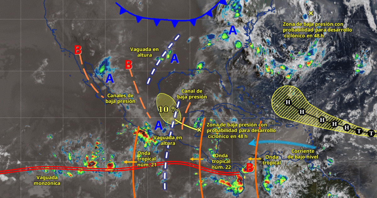 Una vaguada en altura recorrerá el sureste y sur de México y originará lluvias puntuales muy fuertes en Veracruz, Oaxaca, Puebla y Guerrero. Asimismo, una zona de baja presión con probabilidad para desarrollo ciclónico asociada a la onda tropical núm. 22 propiciará lluvias puntuales intensas en Campeche; y puntuales muy fuertes en Quintana Roo, Yucatán, Tabasco y Chiapas.