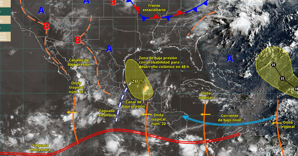 El monzón mexicano, ondas tropicales y canales de baja presión traerán lluvias muy fuertes en gran parte del país, con riesgo de encharcamientos e inundaciones, mientras el norte y litoral registrarán temperaturas superiores a 45 °C.