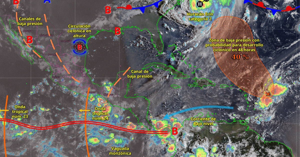 Para hoy, el monzón mexicano mantendrá la probabilidad de lluvias fuertes a puntuales muy fuertes en Nayarit y Sinaloa; puntuales fuertes en Durango, Chihuahua y Sonora; intervalos de chubascos en Baja California Sur; y lluvias aisladas en zonas de Baja California. Por su parte, una circulación ciclónica en altura que prevalecerá en el noreste del territorio nacional, originará lluvias puntuales muy fuertes en Tamaulipas y Coahuila; y puntuales fuertes en Nuevo León. Simultáneamente, un canal de baja presión que se extenderá sobre el norte y centro de México y el ingreso de aire húmedo del golfo de México, generarán lluvias puntuales muy fuertes en Veracruz y San Luis Potosí; puntuales fuertes en Tlaxcala, Morelos, Ciudad de México, Estado de México, Guanajuato, Aguascalientes y Zacatecas; chubascos en Hidalgo y lluvias aisladas en zonas de Querétaro, mientras que el flujo de aire húmedo del océano Pacífico, originará lluvias puntuales muy fuertes en Michoacán; y puntuales fuertes en Colima y Jalisco. A su vez, la onda tropical núm. 24 sobre el sur del país, ocasionará lluvias puntuales muy fuertes en Oaxaca, Puebla y Guerrero. La entrada de aire húmedo proveniente del mar Caribe y un canal de baja presión extendido desde la península de Yucatán hasta el sureste mexicano, mantendrá la probabilidad de lluvias puntuales intensas en Chiapas; puntuales muy fuertes en Tabasco; puntuales fuertes en Campeche e intervalos de chubascos en Quintana Roo y Yucatán. Finalmente, continuará el ambiente caluroso a muy caluroso por la tarde sobre la mayor parte de la República Mexicana, y muy caluroso en el norte del litoral de Pacífico y península de Baja California, con temperaturas máximas que podrán superar los 45 °C en el noreste de Baja California, oeste y noroeste de Sonora. Asimismo, prevalecerá la onda de calor en Baja California Sur.