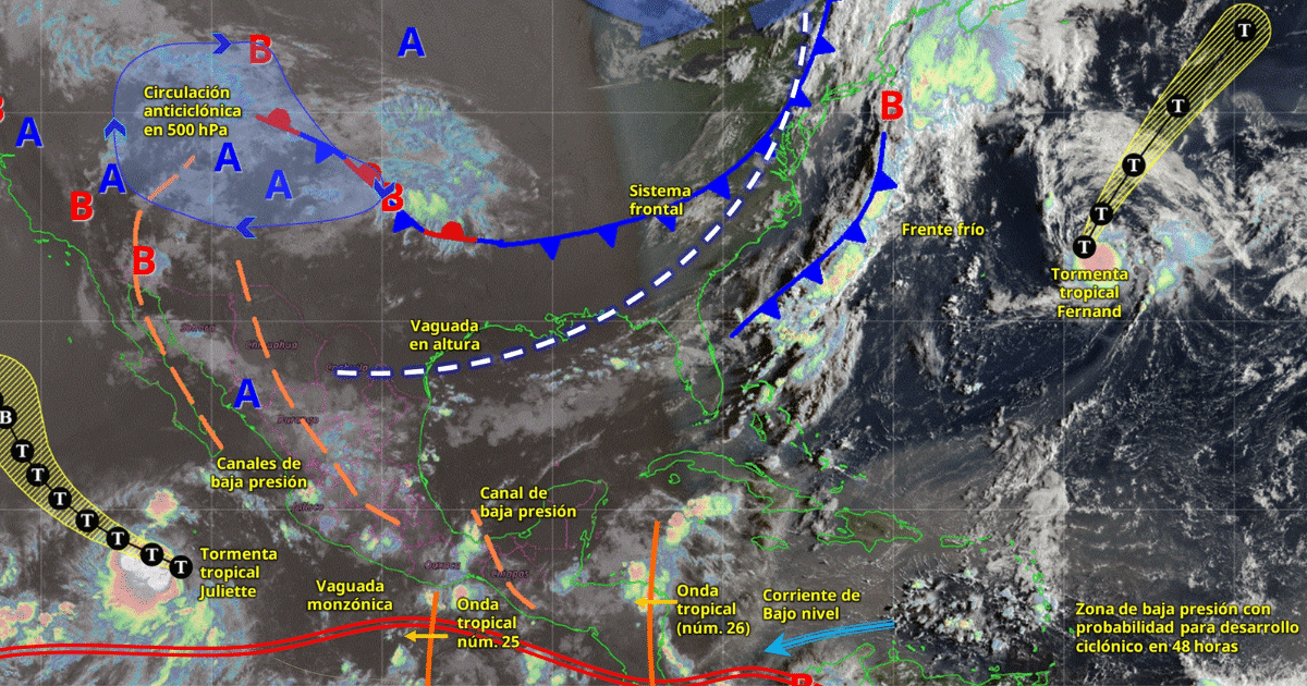 La tormenta tropical Juliette, situada al sur de la península de Baja California, generará oleaje de 1.5 a 2.5 metros de altura en la costa sur de Baja California Sur. Finalmente, continuará el ambiente cálido a caluroso por la tarde en la mayor parte de la República Mexicana, y muy caluroso en zonas de Baja California Sur y Sonora, llegando a ser extremadamente caluroso con temperaturas máximas superiores a los 45 °C en el noreste de Baja California.