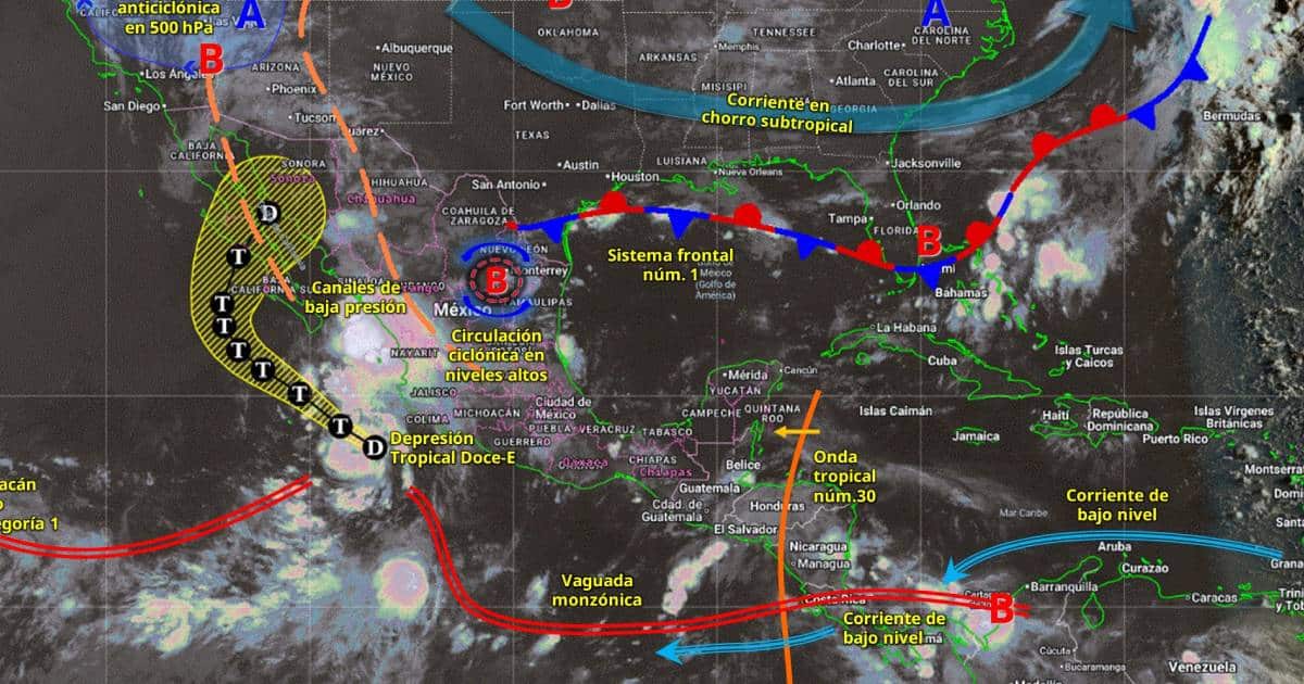 La depresión tropical podría intensificarse a tormenta tropical en el transcurso de hoy. A su vez, el sistema frontal núm. 1, con características de estacionario sobre el noreste del país, interaccionará con una circulación ciclónica en altura y generarán lluvias puntuales intensas en Nuevo León y Tamaulipas; y puntuales muy fuertes en Coahuila, además de rachas de viento de 40 a 60 km/h y refrescamiento de las temperaturas en el norte de dichos estados.