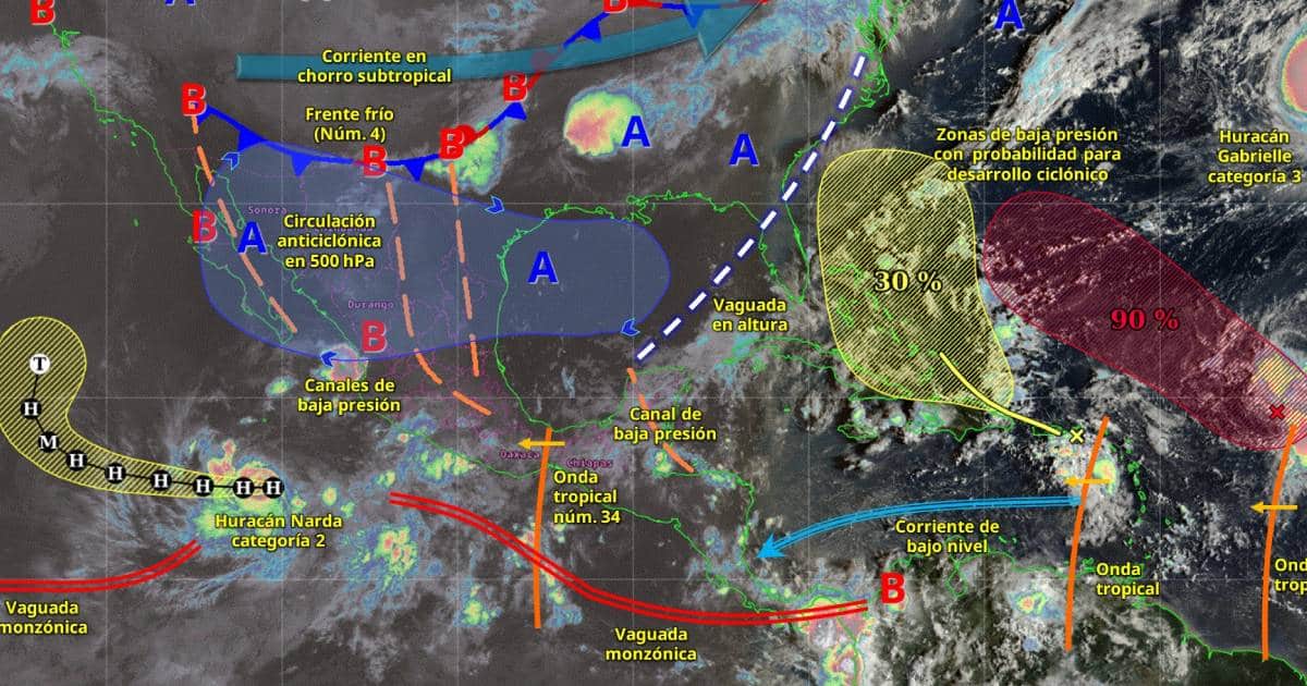 Un canal de baja presión y una vaguada en altura sobre la península de Yucatán, generarán lluvias puntuales muy fuertes en Yucatán y Campeche; y puntuales fuertes en Quintana Roo.