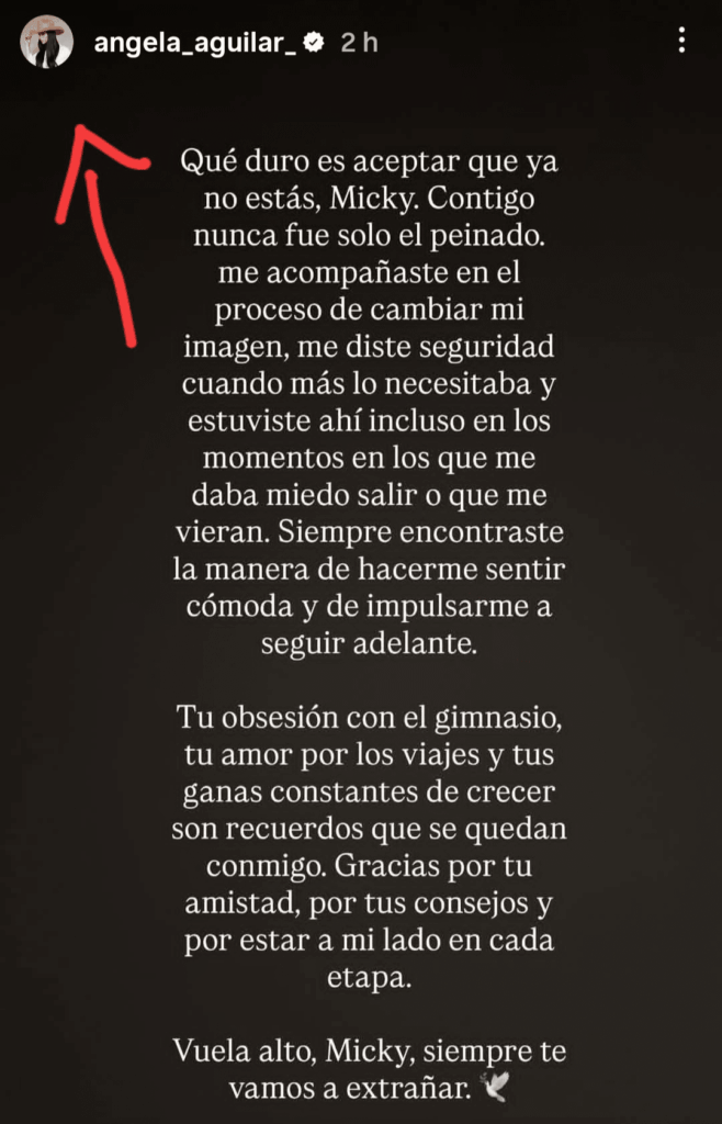“Qué duro es aceptar que ya no estás, Micky. Contigo nunca fue solo el peinado. Me acompañaste en el proceso de cambiar mi imagen, me diste seguridad cuando más lo necesitaba y estuviste ahí incluso en los momentos en los que me daba miedo salir o que me vieran”, escribió la intérprete.