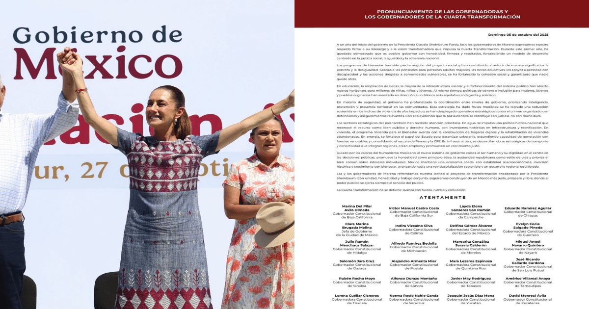 Ciudad de México, 5 de octubre de 2025.– Las y los gobernadores emanados de Morena expresaron su respaldo firme a la Presidenta Claudia Sheinbaum Pardo, al cumplirse el primer año de su gobierno, destacando su liderazgo transformador, su compromiso con la honestidad y los resultados alcanzados en beneficio de las familias mexicanas.