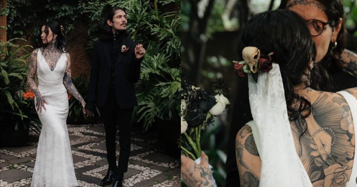 La novia eligió un vestido blanco acompañado de accesorios poco convencionales, como cráneos decorativos y cuervos, que aportaron un toque simbólico a la ceremonia.