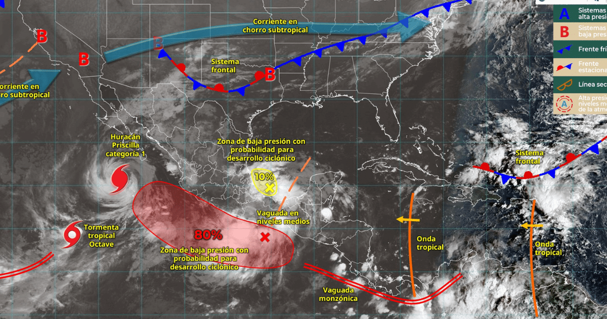 Para hoy el huracán Priscilla se desplazará frente a la costa oeste de Baja California Sur. Su circulación y bandas nubosas ocasionarán lluvias puntuales muy fuertes en Baja California Sur, e intervalos de chubascos en Sinaloa y Nayarit, además de fuertes rachas de viento y oleaje elevado en las costas de Baja California Sur, Sinaloa y Nayarit. Por su parte, una zona de baja presión con alta probabilidad para desarrollo ciclónico en el océano Pacífico, se localizará al sur de las costas de Chiapas y Oaxaca, mientras que una segunda zona de baja presión con probabilidad para desarrollo ciclónico se desplazará frente a las costas de Veracruz y Tabasco.