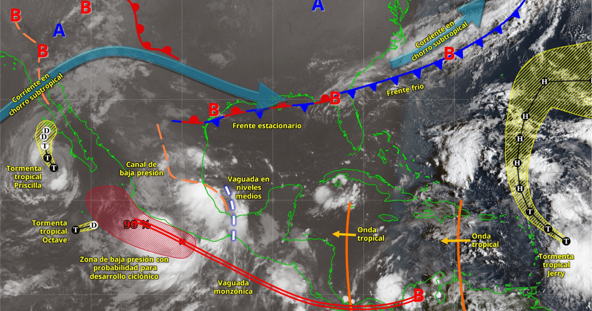 Por otra parte, una zona de baja presión con probabilidad para desarrollo ciclónico o posible ciclón tropical, se localizará frente a las costas de Guerrero y Michoacán, su extensa circulación y desprendimientos nubosos, en interacción con un canal de baja presión sobre el noreste y oriente del país, además de los desprendimientos nubosos de la vaguada monzónica en el Pacífico Sur Mexicano, mantendrán un temporal de lluvias muy fuertes a intensas en las regiones mencionadas, además del sur y sureste del territorio nacional.