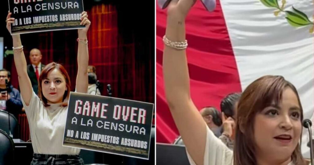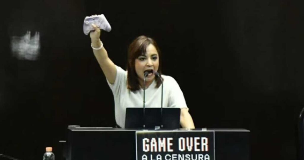 Desde el pleno, con un control de Xbox en la mano y un singular letrero con la frase “¡Game Over a la censura!”, la diputada de Movimiento Ciudadano (MC) se posicionó en contra de la polémica iniciativa y lanzó un reto para que se demuestre algún fundamento sólido para avalar el impuesto.