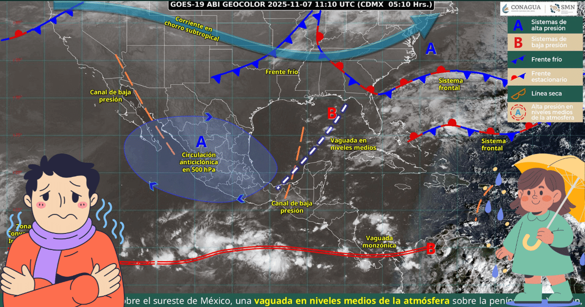 Un canal de baja presión y la entrada de humedad generarán chubascos en el sureste y la Península de Yucatán, mientras que un sistema anticiclónico provocará heladas de hasta -10°C en el norte del país.