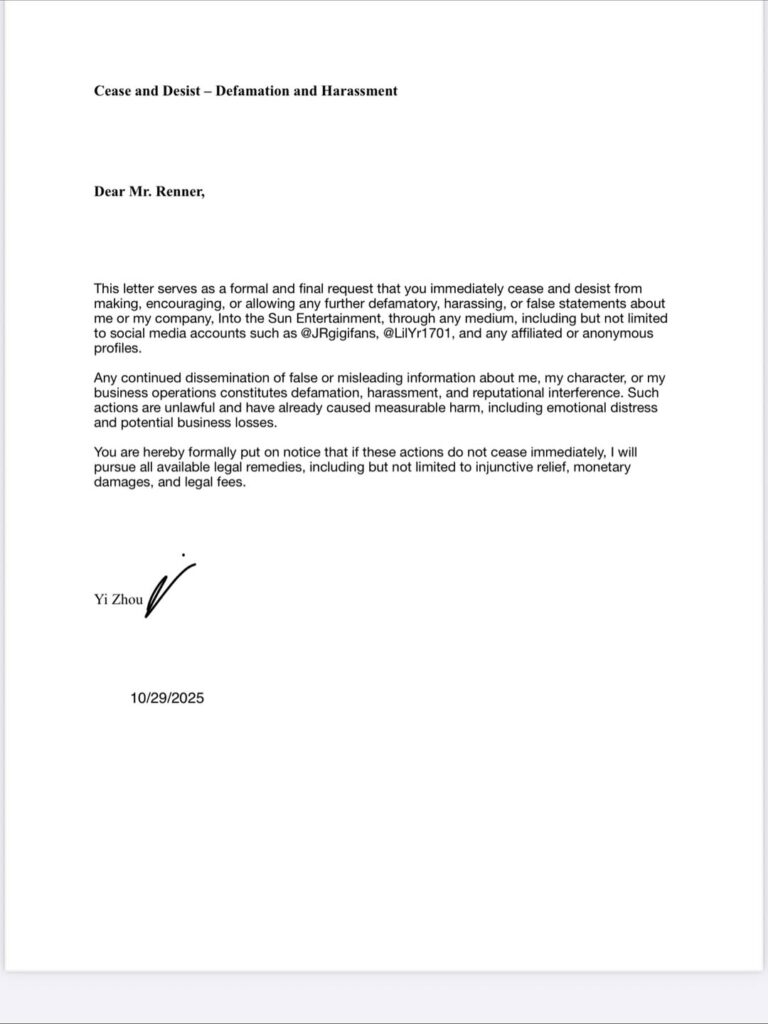 Zhou envió varias cartas al actor solicitando el cese de los abusos y la intimidación. En ellas, le exige detener cualquier tipo de hostigamiento, amenazas o interferencias con su carrera profesional.