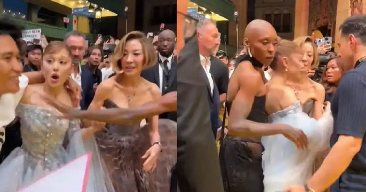 La cantante y actriz, quien interpreta a Glinda en la esperada secuela dirigida por Jon M. Chu, fue abordada por un fan que irrumpió en plena “alfombra amarilla”. Su compañera de elenco, Cynthia Erivo, intervino de inmediato para protegerla.