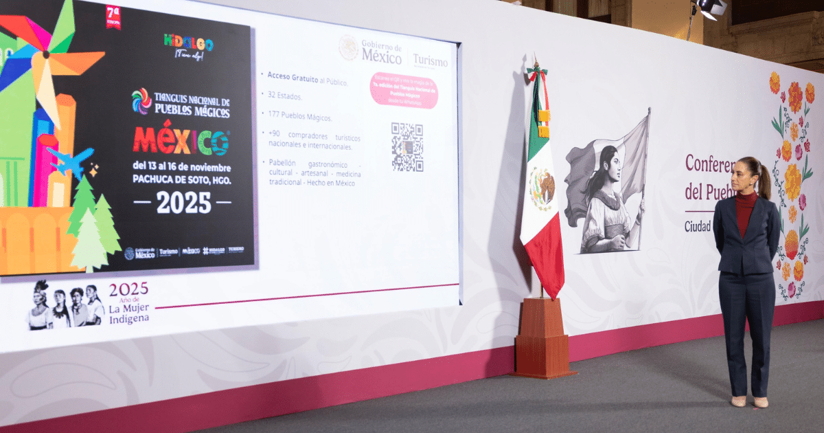 También, invitó a las y los mexicanos a asistir al Tianguis Nacional de Pueblos Mágicos 2025 que se realiza hasta el 16 de noviembre en Pachuca de Soto, Hidalgo, con la presencia de los 32 estados de la República, 177 Pueblos Mágicos y más de 90 compradores turísticos nacionales e internacionales. Contará con pabellones gastronómicos, culturales, artesanales, de medicina tradicional y de productos Hecho en México.